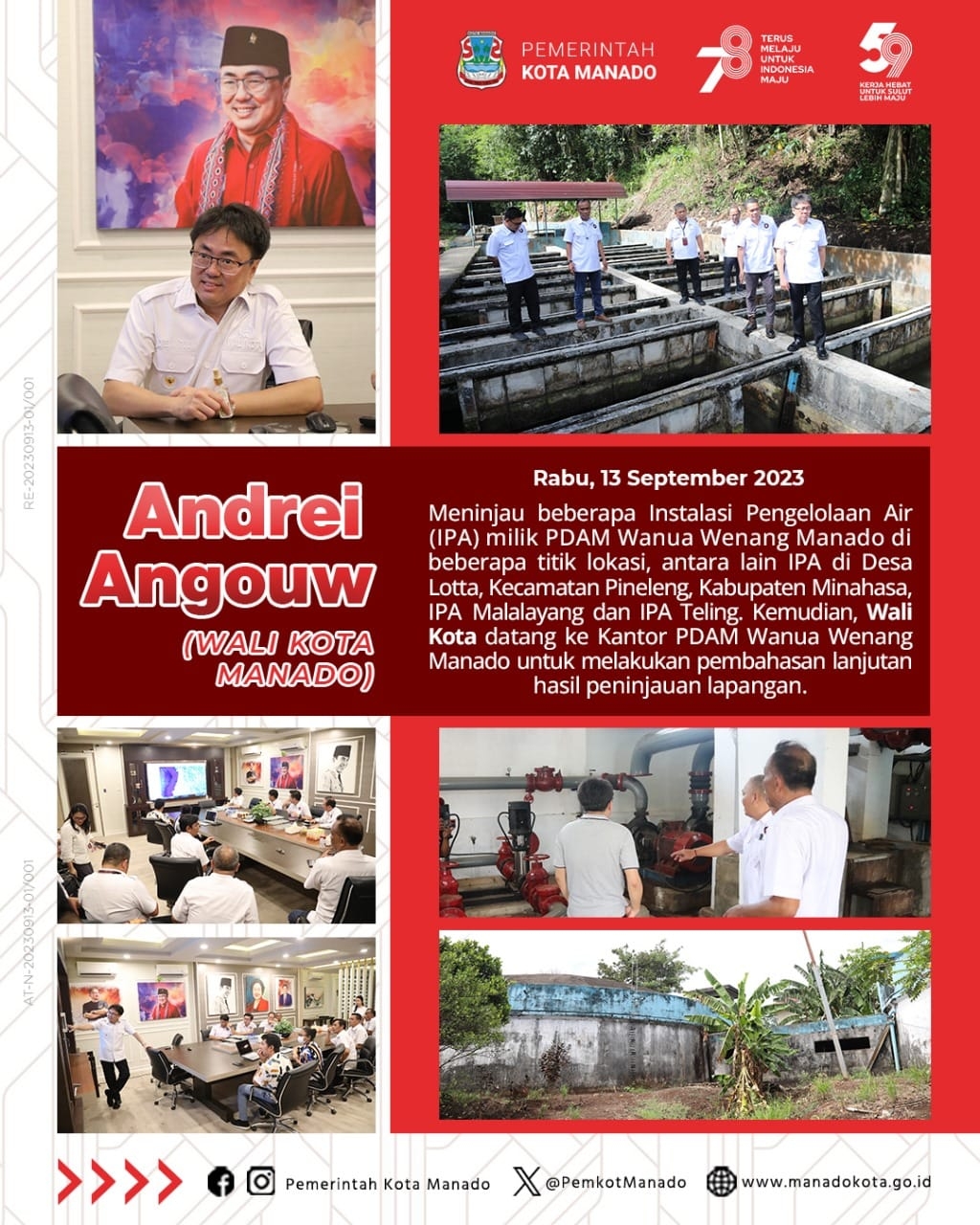 Rabu, 13 September 2023, Wali Kota Manado Bpk. Andrei Angouw meninjau beberapa Instalasi Pengelolaan Air (IPA) milik PDAM Wanua Wenang Manado di beberapa titik lokasi, dan melakukan pembahasan hasil tinjauan lapangan di Kantor PDAM Wanua Wenang Manado. Lokasi pertama yang dikunjungi Wali Kota adala